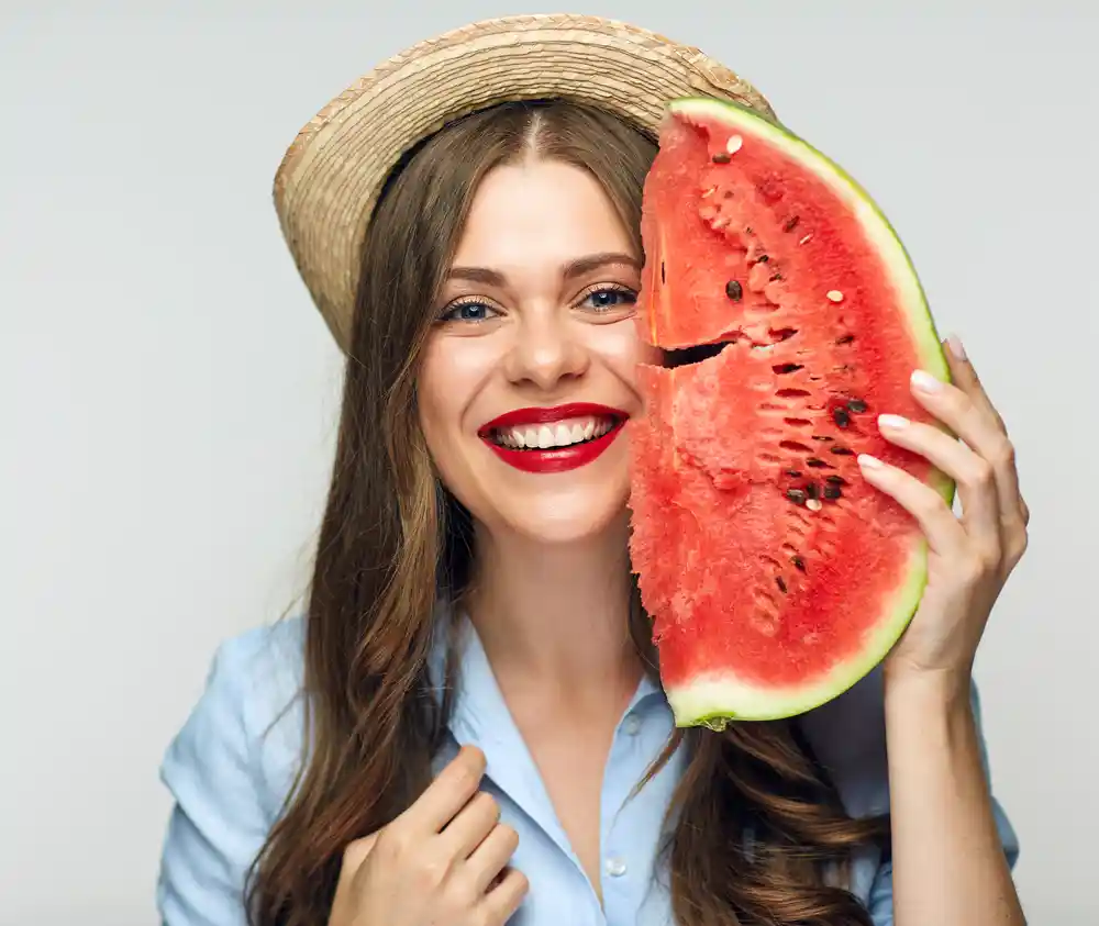 امرأة سعيدة بفوائد البطيخ للجسم والبشرة